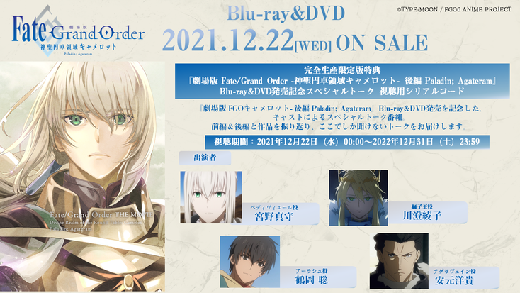 2021年12月22日(水)に発売となる『劇場版 Fate/Grand Order -神聖円卓領域キャメロット- 後編 Paladin; Agateram』Blu-ray&DVDの完全生産限定版特典へ”『劇場版 Fate/Grand Order -神聖円卓領域キャメロット- 後編 Paladin; Agateram』Blu-ray&DVD発売記念スペシャルトーク視聴用シリアルコード”の封入が決定。
