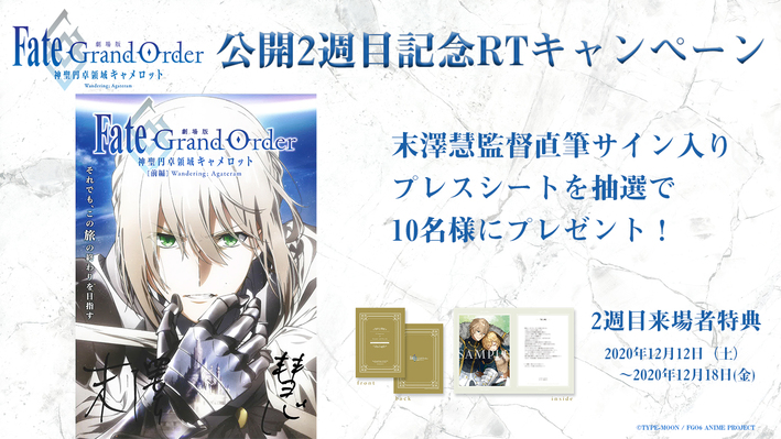 公式Twitterアカウント(@FGOAP_ep6)をフォローいただき、「公開2週目記念フォロー&RTキャンペーン」ツイートをリツイート頂いた方の中から抽選で10名様に末澤慧監督サイン入りプレスシートをプレゼントいたします。