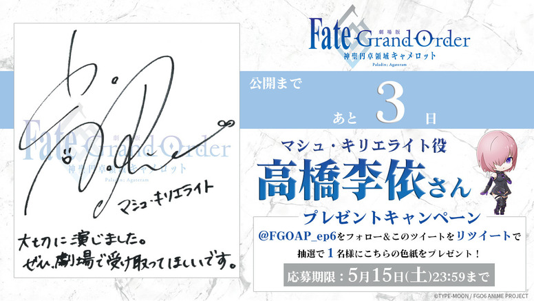 公式Twitterアカウント(@FGOAP_ep6)をフォローいただき、カウントダウンツイートをリツイート頂いた方の中から抽選で1名様にこちらの色紙をプレゼントいたします。