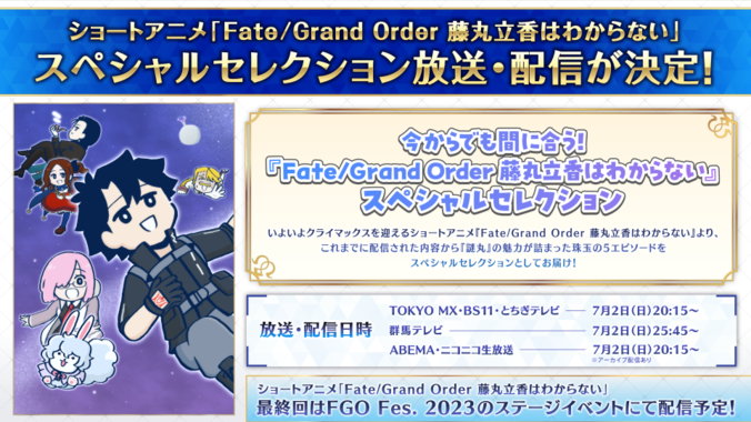 『今からでも間に合う!「Fate/Grand Order 藤丸立香はわからない」スペシャルセレクション』の放送・配信が決定いたしました!