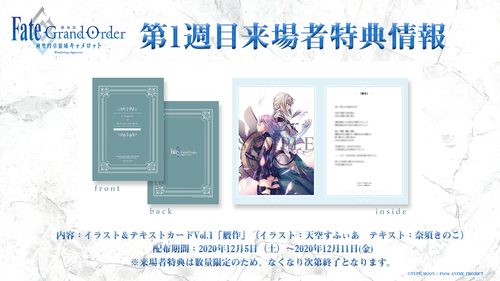 『劇場版Fate/Grand Order -神聖円卓領域キャメロット-前編Wandering; Agateram』 の1週目来場者特典を解禁いたしました。劇場来場者特典は1~4週にわたり、毎週異なる「イラスト&テキストカード」を配布します。