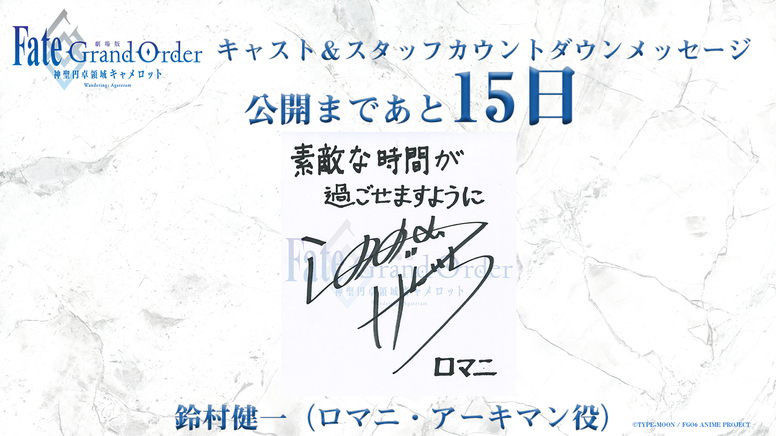 202011.20 [ 神聖円卓領域キャメロット ] 【公開まであと15日】スタッフ&キャストカウントダウンメッセージ公開 12月5日(土)の公開まで毎日キャスト・スタッフによるカウントダウンメッセージを公開いたします。本日はロマニ・アーキマン役・鈴村健一さんからのメッセージをご紹介です。 NEWS INDEX